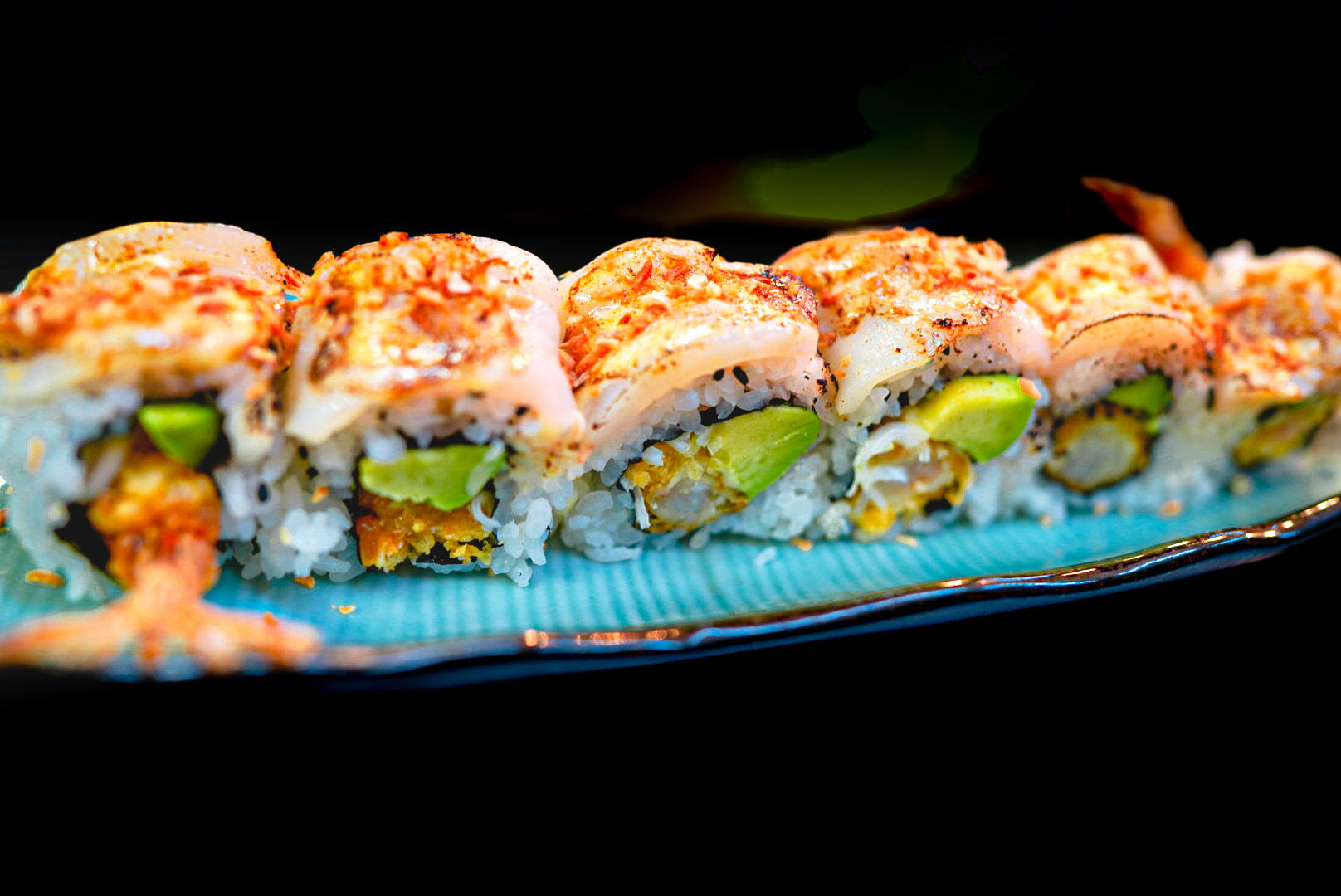 This is the Two Tickets to Paradise roll with tempura fried shrimp, torched scallop, miso aioli, avocado and toasted coconut.